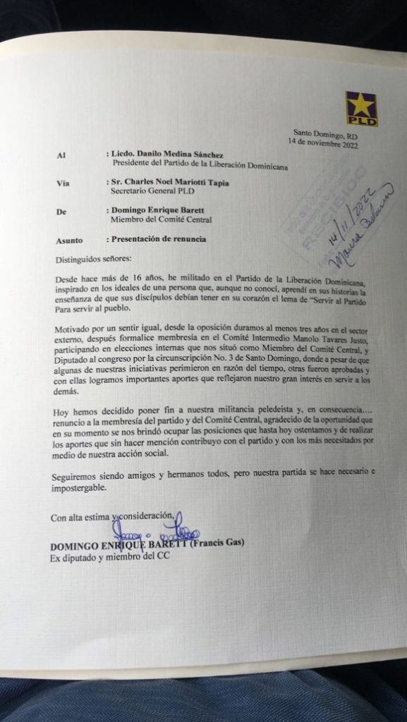 Santo Domingo. – El empresario y ex diputado Domingo Barett, conocido como Francis Gas, anunció este viernes su desvinculación de las filas del Partido de la Liberación Dominicana (PLD).